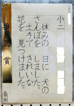 狭き門である硬筆中央展覧会に見事出展された作品です。県展に行きたいという強い気持ちで、お稽古だけでなく、家での練習もたくさん頑張ってくれました。本当に本当におめでとう!!