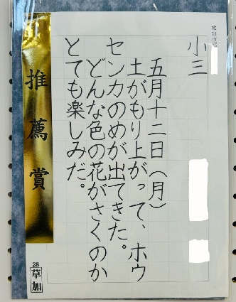 お習字を習っている=必ず金賞獲れる。ではありません。クラスにお習字を習っている子が何人いるでしょうか。その中のたった5〜6人しかもらえない金賞。だからこそ、嬉しいよね(*^^*)