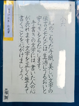 はじめての書き初めである3年生から学校代表がたくさん出たこと、2年連続で4年生2名が県展へ出品されたことは大変素晴らしいです!